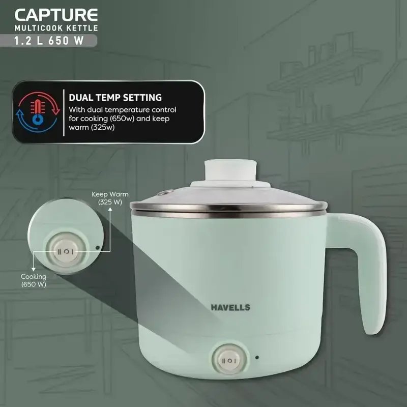 Havells Capture 1.2 Ltr Multi Cook Kettle with Steamer Basket| 304 SS Rust Resistant Body | Wider Mouth| Keep Warm Function | Steam Sensor Auto Cut Off | Cool Touch Outer Body | 2 Yr Warranty
