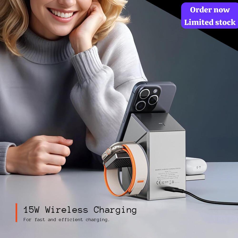 - Wireless Charging Station, CubeTrick-X Qi2 15W Fast Charge, 3 in 1 Wireless Charging Station for Apple Watch Charger, for iPhone 16, 15, 14, 13, 12 Series, AirPods (30W USB Charger Included)